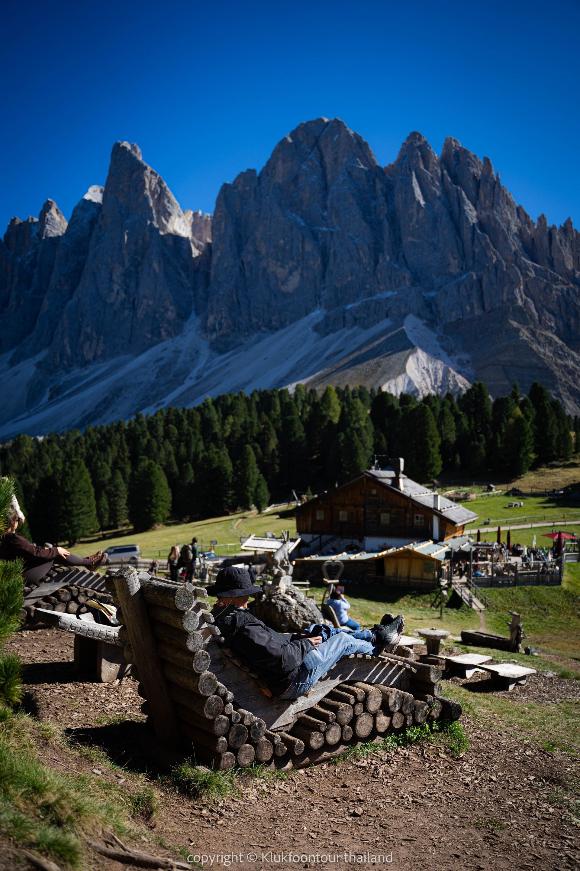 12.00น ถึง Cinema delle Odle หรือ Geislerkino เป็นจุดชมวิวกลางแจ้งในเทือกเขา ที่มี "เก้าอี้ไม้เอนหลัง" ในหุบเขา Val di Funes โดยเก้าอี้หันหน้าเข้าหาเทือกเขา Odle (Geisler) ที่ตั้งตระหง่านเหมือนหน้าจอภาพยนตร์ธรรมชาติขนาดยักษ์