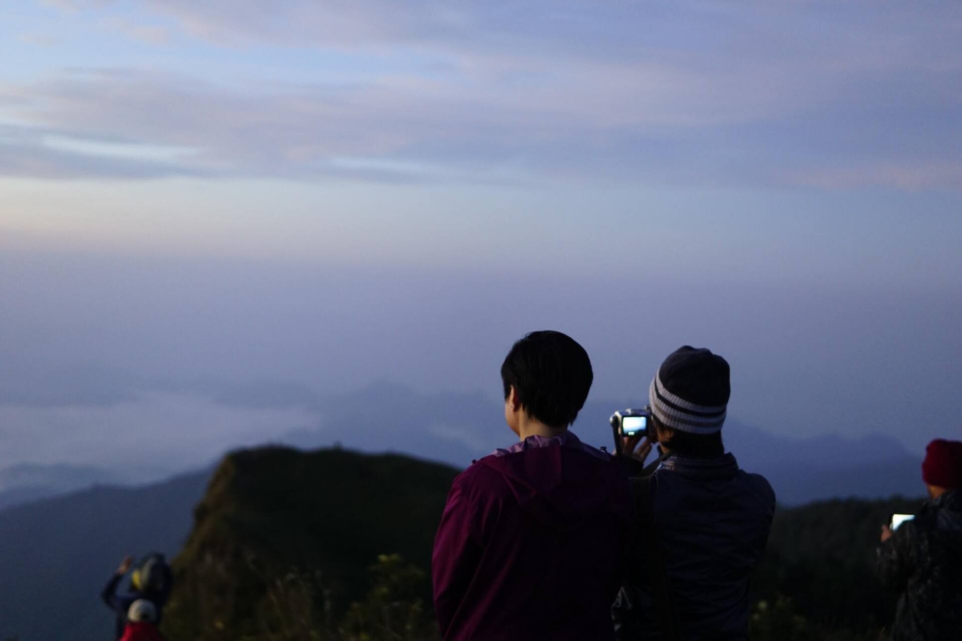 16.30น เดินขึ้นไปชมแสงเย็น ชมพระอาทิตย์ตกที่สันหนอกวัวเล็ก ถ่ายภาพวิว และ ป้ายเขาสันหนอกวัวกาญจนบุรี