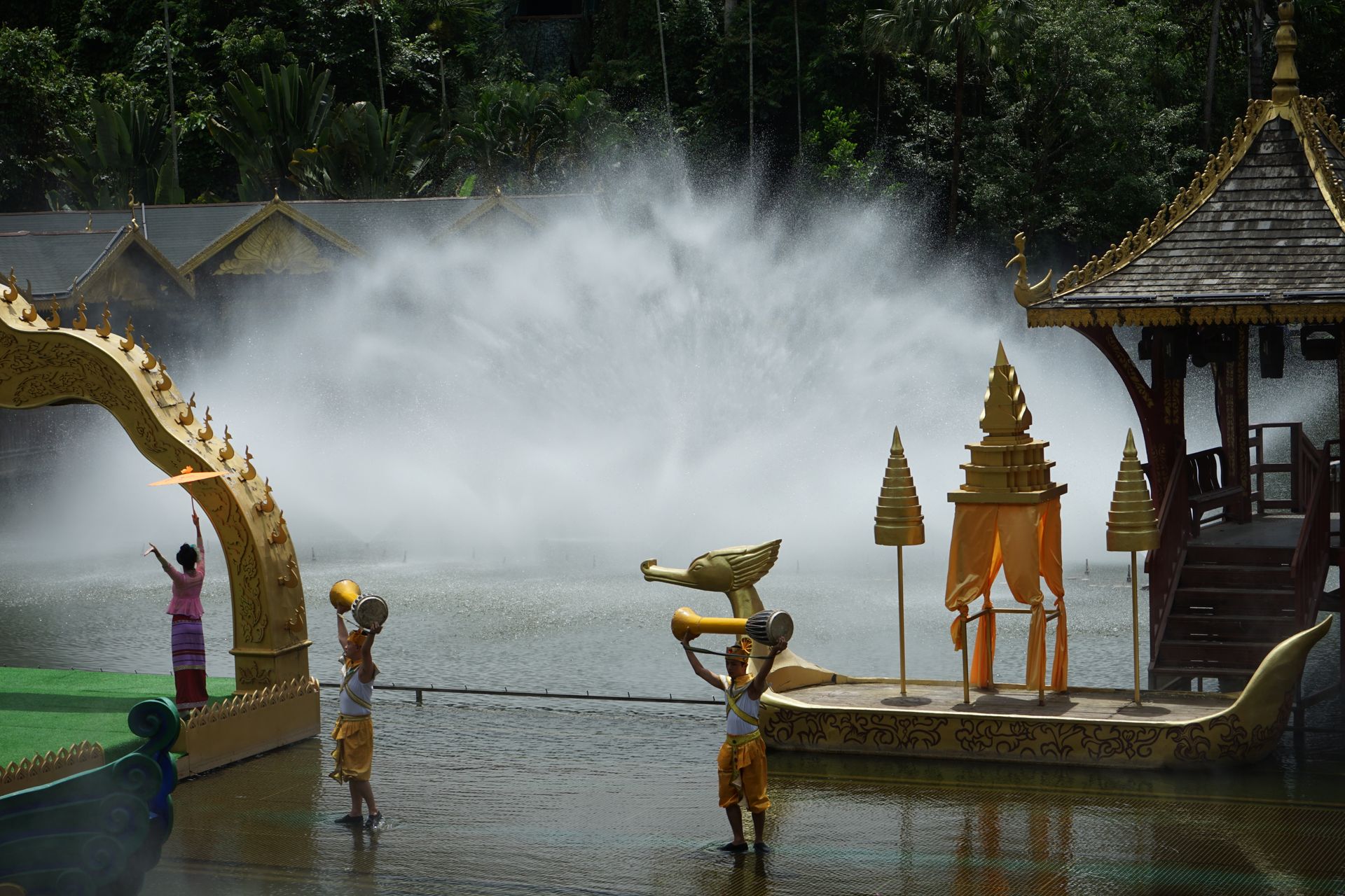 -น้ำตกเก้ามังกร น้ำตกที่ตกลงมาจากเขาสูงหลายสิบเมตร ด้านล่างมีรูปปั้นชาวประมงถือดาบสู้กับมังกร